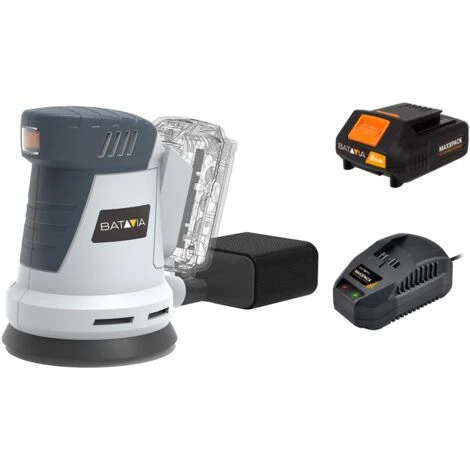 Poncez rapidement de grandes surfaces avec la ponceuse orbitale aléatoire ! La ponceuse orbitale aléatoire sans fil BATAVIA 7063457 ponce de grandes surfaces plus rapidement qu’avec une ponceuse orbitale, par exemple. En effet, les mouvements excentriques ont un double effet par rapport aux mouvements circulaires. Grâce à sa conception compacte avec un centre de gravité bas et une répartition uniforme du poids, la ponceuse orbitale aléatoire est facile à manipuler. De plus, la ponceuse est équipée d’une poignée souple pour un travail confortable et sûr. Avec cette ponceuse excentrique, vous pouvez enlever très rapidement les anciennes couches de peinture ou de vernis de grandes surfaces. Dans l’ensemble, cette ponceuse orbitale aléatoire assure un traitement facile et un résultat final beaucoup plus agréable. Qu’est-ce que la plateforme de batterie Maxxpack ?Cette ponceuse est vendue avec batterie et chargeur. La ponceuse fait partie de la plate-forme de batterie Maxxpack. Les batteries et chargeurs interchangeables peuvent être commandés séparément. Les avantages de la ponceuse 18V : * Système de fixation velcro pour un changement rapide du papier abrasif * Équipé d’un sac collecteur de poussière * Conception compacte avec centre de gravité bas et répartition uniforme du poids * Équipé d’une poignée souple pour un travail confortable et sûr Données techniques: * Tension de la batterie : 18V Li-Ion * Vitesse à vide : 12000 min -1 * Excentricité : 2 mm * Surface de ponçage : Ø 125 mm * Poids du produit sans batterie : 1,4 kg * Dimensions du produit (L × l × H) : 12,5 × 12,5 × 17 cm Qu’y a-t-il dans le paquet ? * 1x ponceuse orbitale aléatoire à batterie 7063457 * 1x sac de collecte de poussière * 1x batterie 2.0Ah * 1 chargeur 2,4 Ah * 1x manuel * 1x facture (certificat de garantie) Homologations/certificats :CE, EMC, HAP, RoHS, REACH, GS Commandez directement en lignePrêt à ajouter cette ponceuse à votre collection d’outils ? Ensuite, vous pouvez passer une commande chez nous directement en ligne. Vous bénéficiez immédiatement de notre livraison ultra rapide et de notre excellente garantie. Combien d’années de garantie ?Il y a une garantie de 2 ans sur la ponceuse BATAVIA 7063457, batterie et chargeur fournis. BATAVIADes outils de qualité innovants à un prix attractif ? Chez Batavia, nous développons des produits innovants et respectueux de l’environnement pour un usage professionnel et bricoleur. Les bons outils pour votre travail facilitent la vie et garantissent une finition professionnelle. « BATAVIA : Des outils pour construire !