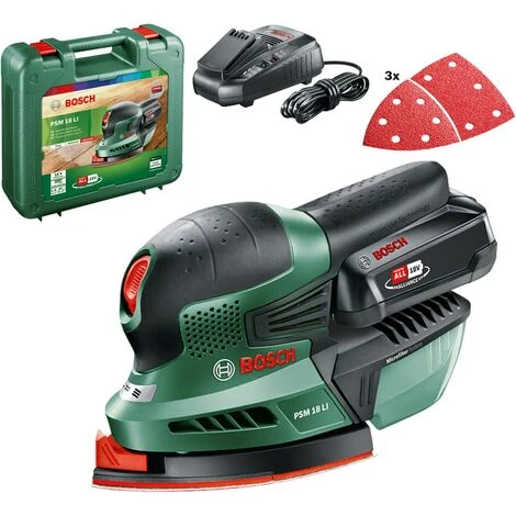 La ponceuse multi sans fil PSM 18 LI est un outil polyvalent à la fois compact et puissant, conçu pour le ponçage et le polissage de petites surfaces et dans les endroits difficiles d’accès. Le système microfiltre Bosch de la PSM 18 LI permet de travailler proprement. Il fait appel à un élément d’aspiration intégré chargé de diriger la poussière de ponçage directement dans le boîtier microfiltre fourni. Une batterie Lithium-Ion puissante et un chargeur sont disponibles en temps qu’accessoires. Tous deux sont compatibles avec tous les outils du système 18 V Bosch. La puce Syneon intégrée de Bosch assure une durée de fonctionnement plus longue par charge de batterie. Ainsi, même les travaux de longue durée ne posent aucun problème.