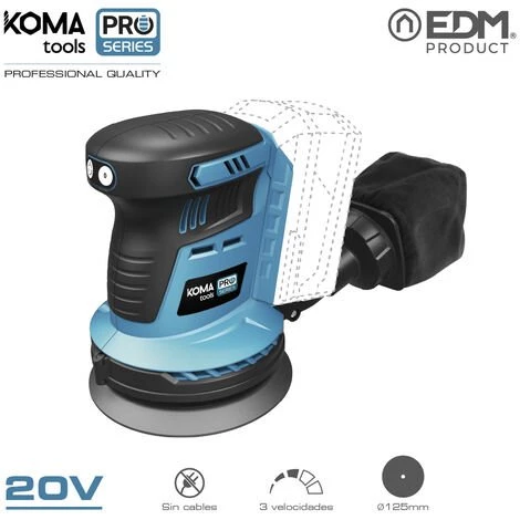 PONCEUSE EXCENTRIQUE 20V (BRUSHLESS SANS BATTERIE ET CHARGEUR) 13x30x15cm KOMA TOOLS PRO SERIES BATTERYPONCEUSE EXCENTRIQUE. PISSANCE: 20V BRUSHLESS LI-ION (SANS BATTERIE ET CHARGEUR) 3 VITESSES 6000/8500/11000rpm. SAC DE COLLECTE DE POUSSIÈRE. DISQUE DE Ø125mm. ORBITE 2,5 mm. ACCESSOIRES : 1 SAC À POUSSIÈRE + 1 PAPIER DE VERRE. DIMENSIONS: 13x30x15cm (largeur/profondeur/hauteur) KOMA TOOLS PRO SERIES BATTERY