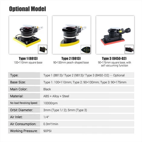 3 modèles pour votre option : 8813 a une base carrée de 100 x 110 mm/ 9813 a une base en forme de pêche de 90 x 130 mm/ 8450-D2 a une base carrée de 90 x 175 mm et dispose d’un aspirateur automatique, avec un tube d’aspiration et un sac en tissu.