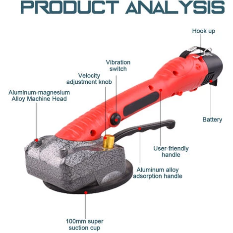Il s’agit d’une sorte de machine à carreler de qualité, avec une grande ventouse de 100 * 100 mm, supportant une opération à une main, avec une capacité d’adsorption de 45 kg. 10 vitesses de fréquence réglables, vous pouvez l’ajuster facilement via le bouton de rotation. Facile à corriger la position du carreau, il suffit d’appuyer fermement sur la poignée et de retirer le carreau. Largement application: convient à la pose de carreaux de 0,6 à 1,2 m.