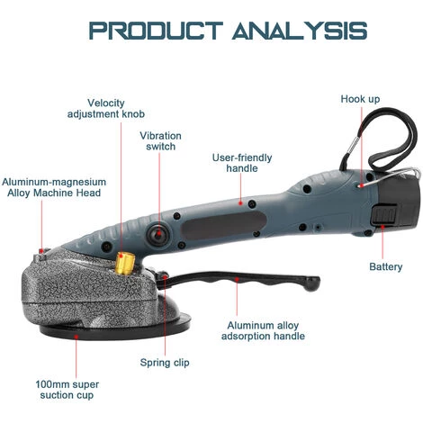 Il s’agit d’une sorte de machine à carreler de qualité, avec une grande ventouse de 100 * 100 mm, supportant une opération à une main, avec une capacité d’adsorption de 45 kg. 10 vitesses de fréquence réglables, vous pouvez l’ajuster facilement via le bouton de rotation. Facile à corriger la position du carreau, il suffit d’appuyer fermement sur la poignée et de retirer le carreau. Largement application: convient à la pose de carreaux de 0,6 à 1,2 m.