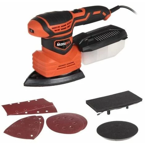 Manupro Ponceuse électrique filaire multifonction 3 en 1 vibrante : ponceuse triangulaire, excentrique et vibrante – Puissance 200 W – Assemblage rapide : Utilisation intuitive avec changement facile du papier abrasif grâce au systeme auto-agrippant et systeme de serrage sans outil – Variateur de vitesses – 6 vitesses – Rotation : de 7000 a 12000 tours par minute – Aspiration intégrée et collecteur de poussieres