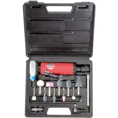Description du produit Le meilleur outil pour le meulage du métal, du plastique et du bois dans le passe – temps sur le terrain est sans aucun doute le broyeur pneumatique Valex 1553013 : petit, maniable , facile à utiliser, accompagné de 10 meules abrasives de différentes formes et dimensions, cet outil est fourni dans un cas pratique de plastique noir utile pour ranger tous les accessoires dans l’ordre et les transporter facilement. Les principaux composants du broyeur sont: Corps en aluminium avec gâchette et dispositif de sécurité intégré n. 2 mandrins du diam. 6 mm et 3 mm Connexion avec filtre à air Connexion pour le raccordement du tuyau d’air n. 10 moletti de forme et de taille différentes pour différentes utilisations Nous recommandons toujours l’utilisation d’ air comprimé propre, lubrifié avec de l’huile et sans humidité; la pression d’alimentation doit nécessairement être réglée en fonction de l’ utilisation pour éviter d’endommager l’outil; il est donc nécessaire de raccorder l’outil à un détendeur avec un manomètre dont la pression d’air doit toujours être contrôlée. Caractéristiques générales puissance Air comprimé corps aluminium pression max 6,2 bar Air consommé 330 lt / min Tourne autour 22000 / min Capacité de broche n.1 à partir de 3 mm et n. 1 à partir de 6 mm lubrifiant Huile minérale poids 1,20 kg Niveau de bruit 98,5 dB (A)