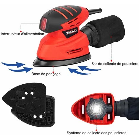 Puissante et Efficace: Cette ponceuse vibrante fonctoinne 15000 fois chaque minute avec le moteur puissant de 130W, planche de fond de 140 x 140 x 80mm et diamètre de l’orbite de 2mm réalisent facilement le ponçage, plus efficace comparée avec le ponçage manuel.