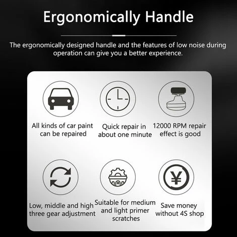 Gain de temps et d’argent :</ b> Que vous soyez un nouveau conducteur ou un ancien conducteur avec des années d’expérience de conduite, cette machine à polir est un outil indispensable, avec cet outil, vous n’avez pas besoin d’aller aux réparations automobiles magasinez fréquemment.