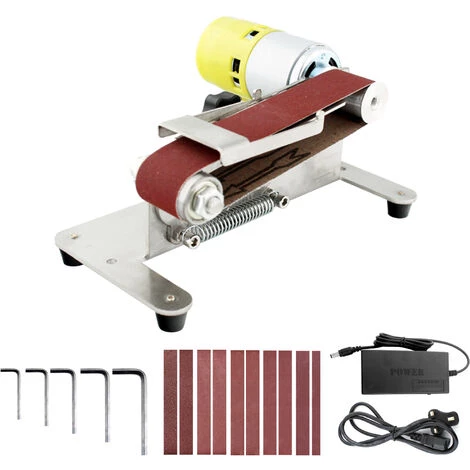 Le kit comprend une mini ponceuse à bande, un adaptateur secteur avec 7 vitesses variables, 10 bandes abrasives (30×330 mm) et 5 clés hexagonales.