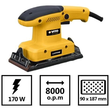 La ponceuse vibrante VILV170 de VITO délivre une puissance de 170W soit une puissance d’enlèvement et un taux de collecte de poussières élevés. Sa vitesse de rotation est de 10000 tr/mn pour une surface de ponçage de 90 x 187 mm. Elle a un système EASY EXCHANGE ce qui permet un changement facile du papier de verre. De plus sa forme ergonomique avec sa poignée ABS noir permet de travailler sans fatigue. Elle est livrée avec une bande abrasive. Sa conception robuste avec un plateau extra dur et sa double isolation garantissent une durée de vie maximale. Son poids est de 1,1 kg et elle est certifiée CE. Ses dimensions sont de 245 mm de long et 160 mm de haut. Elle est alimentée en 230V.
